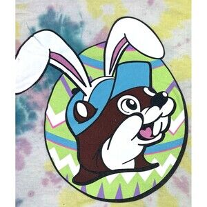 The Buc-ees Easter Shirt is a colorful tie-dye t-shirt in adult size small, perfect for celebrating the spring season. Made from cotton with a crew neck and short sleeves, this regular fit shirt features a fun Easter theme with the character Buc-ees from the brand's family. Easy to care for with machine washable instructions, this multicolor shirt is a great addition to any unisex adult's wardrobe looking to make a playful statement this Easter.