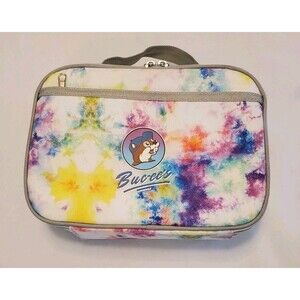 The Buc-ee's Insulated Lunch Box features a bright pastel tie-dye design with a unique truckstop zip-around pocket. Made from durable nylon, this rectangle-shaped lunch box stands out with its vintage/retro style and tie-dye pattern. Perfect for teens, boys, girls, and kids, this lunch box is easy to clean and showcases the iconic Buc-ees brand logo. The tie-dye design adds a fun and colorful touch to the lunch box, making it a stylish and practical choice for everyday use.