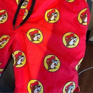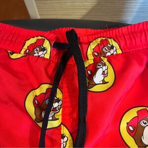 Vibrant red swim shorts featuring Buc-ee's logo. Perfect for a fun day at the beach or pool.