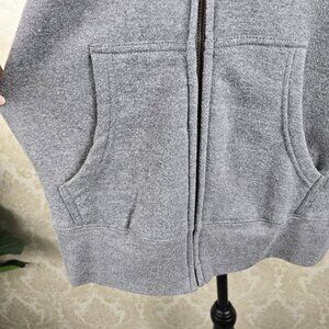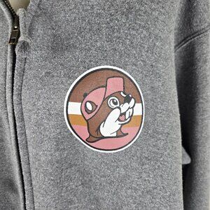 Gray zip front jacket is has a drawstring hood. Long sleeves with thumb holes at the cuffs. Buc-ee's Beaver logo on the left side of the chest. Front pockets. Great piece to thrown on and go or for a casual lounging day.