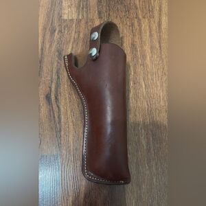 Stylish brown leather holster with contrast stitching. Perfect for secure carrying.