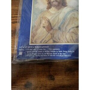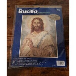 This Bucilla counted cross stitch kit features the image of Jesus Christ, measuring 11x14 inches in size. The kit includes fabric/cloth and thread/floss, ready for you to create a beautiful framed picture. The design is a sampler style, with a vintage 1999 theme and features that make it both unique and complete.