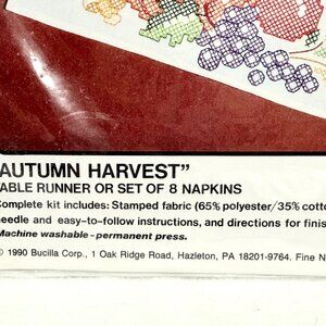 Vintage Bucilla "Autumn Harvest" stamped cross stitch of 8 napkins. This is the kit for the napkins only. Vintage 1990 kit new/sealed condition. The size of the napkins is not indicated on the outer package.
