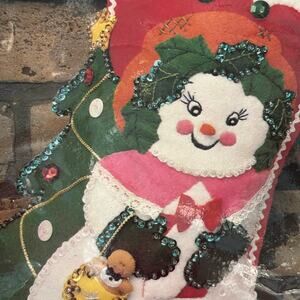 Vintage Bucilla Christmas Heirloom felt appliqué stocking kit “Mrs. Frosty” #20536. Finished size approx. 17" long. Features a snowman design with purse and envelope with red bow. Such sweet cheeks and sparkles!