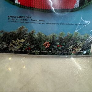 New never opened plastic canvas needlework kit Santa’s all around the candy dish. Great for the Holidays!