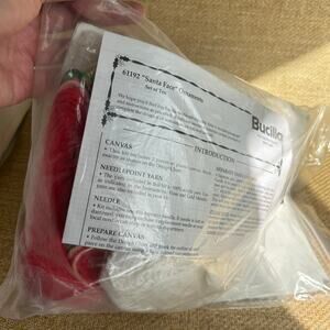 Vintage Bucilla Santa Face Ornaments Kit (No. 61192), new and sealed in original package. Includes materials to make 10 festive Santa face ornaments using plastic canvas and yarn.