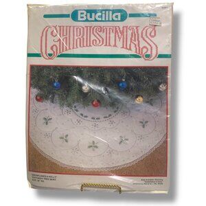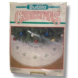 This vintage Bucilla embroidery kit includes all materials to create a 45-inch Snowflakes & Holly tree skirt. Made from 100% cotton fabric.