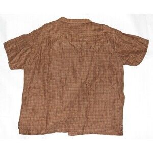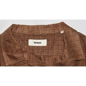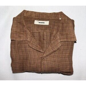 The Buck Mason Men's Short Sleeve Linen Blend Camp Loop Collar Shirt in size Large is a stylish and versatile button-up shirt perfect for casual occasions or parties. Made from a breathable linen-cotton blend, this shirt features a solid brown color with a unique loop collar style. The shirt is designed with a regular fit and includes accents like buttons and pockets, adding practicality to its classic design. Ideal for all seasons, this shirt is a timeless addition to any man's wardrobe.