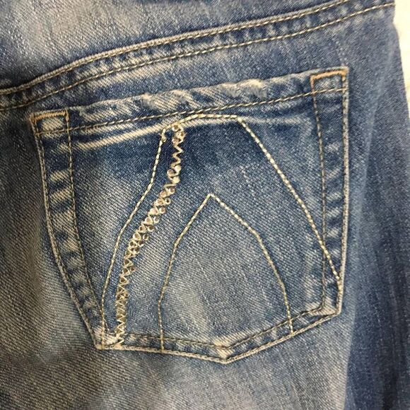 Medium wash, distressed bootcut jeans. Front and back pockets. Button and zipper closure. Pre-owned in good condition. Please refer to pictures for best description and condition verification.