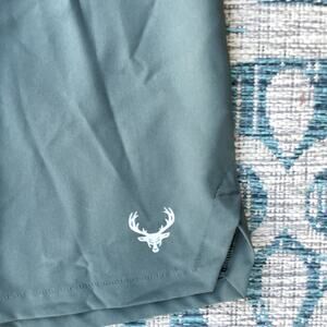 These are Bucked Up athletic/workout shorts designed for comfort and peak performance. The shorts are in a beautiful green shade (e.g., Military Green or Emerald Green). They are constructed from a soft, stretchy, and supportive Polyester Spandex blend, making them lightweight, moisture-wicking, and breathable. This specific style often features a flattering high-waist crossover design and approximately a 6-inch inseam. The material offers a supportive, slim-fit compression that is often described as "buttery soft" and is typically squat-proof. They are perfect for various activities, including HIIT, heavy lifting, yoga, or running. Please review all photos for sizing and condition verification.