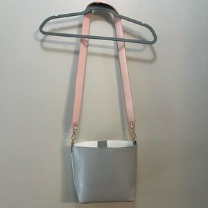 Summer & Rose Crossbody Bucket Bag one side white, other gray with Dusty Rose Wide removable shoulder strap.