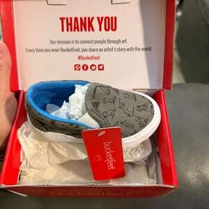BucketFeet Shoodles low-top canvas slip-on sneakers for toddlers, size 4 — featuring a playful Bark & Co. designed dog print.