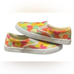 Brighten up your wardrobe with these vibrant Bucket Feet slip-on shoes. Featuring a playful citrus pattern, these shoes are perfect for adding a splash of color to any outfit. Easy to wear and comfortable for all-day play.
