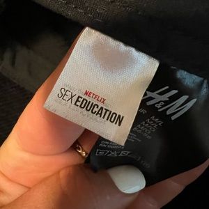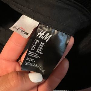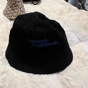 From H&M, I have a bigger head and it fits. It’s a corduroy material. It says “I don’t do boyfriends” in blue stitching