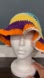 Handmade crochet bucket hat features a colorful design with orange, purple, yellow, teal, and pink sections. The hat is made of yarn and has a soft, flexible structure. No brand or model information is available.