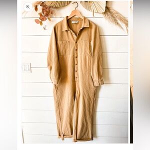 Bucket List Sarah Jumpsuit Tan Button-Up Denim Utility Jumpsuit size medium