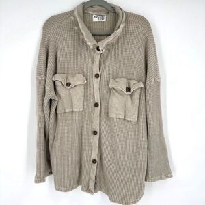 Bucket List Thermal Waffle Henley Oversized Tan Medium Boho Streetwear Shacket Jacket