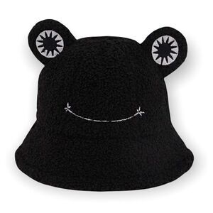 Bucket Hat, animal, Stitching color, plain black color, cute frog embroidery pattern, adjustable head circumference, windproof chin strap, from daily life to holidays, this hat's cozy fabric will keep you looking good and feeling warm. Warm Faux Fur Fleece; Soft, Comfortable and Fashionable; Great for Spring, Fall and Winter. Washing Care Tip - Hand wash and Do Not bleach, flat dry., versatile, weekends, gifting, work, collection, weather, classy fun, protect your head from us rays, mountains, beach, protect your face trendy, can be a Fisherman Hat, boating ,