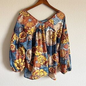 Bucketlist floral cotton babydoll style blouse. Size flowy L. Great preworn condition. This gorgeous top is perfect for any day of the week. The v-neckline is flattering and stylish, and the long puff sleeves are perfect for keeping you comfortable all day long. Pleating throughout gives the top a flattering, feminine shape.