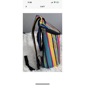 The multicolored striped canvas exterior is eye-catching and the black hardware adds a touch of sophistication. The backpack features a zip closure and is insulated with green lining material to keep your food and drinks cool. It's a great choice for anyone who wants a colorful and functional accessory.