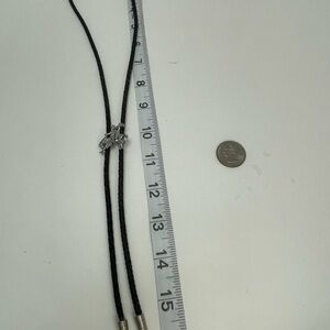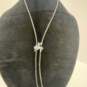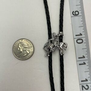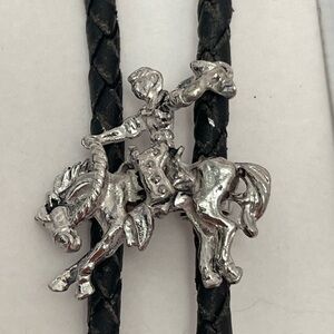 This vintage bolo tie works just as well for a man or for a woman. It is silvertone metal and measures just 1 5/8th inches high and 1 1/2 inches wide. It is in good vintage condition and is on a long black braided leatherette string tie with fancy silvertone metal end caps.