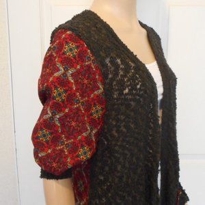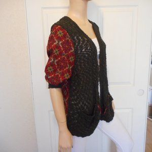 This is a Pieced Sweater Cardigan the Front & Back Shoulder Panel is Black Sweater Mesh Material the Back & Sleeves are a Red Georgette Polyester Material, Short Sleeve, Open Front, 2 Pocket, the Sweater is 67% Cotton 33% Nylon the Printed Pattern is 100% Polyester, This isn't a sweater cardigan.