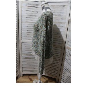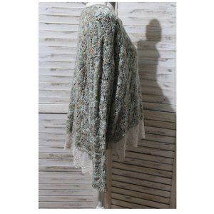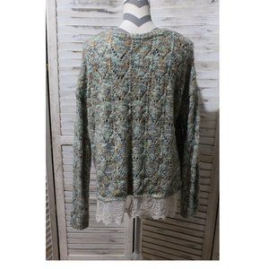Buckle BKE open knit pullover sweater in Size large. Lace hem line, gently used with no flaws. Super soft. Measurements taken flat: pit to pit 26β, length front shoulder to hem of sweater 22β front hem of lace 25β to lace on back hem 28β.
