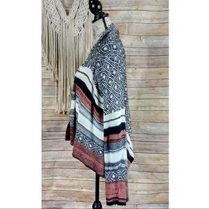Striped flyaway cardigan sweater with Aztec print and an open front.