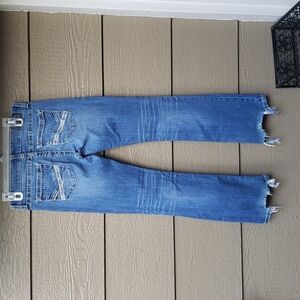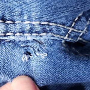 Jeans are in preloved condition. Very Distressed (factory). 1 small hole at crotch. holes near where both back pockets are starting to pull away. very frayed back hem from walking on them.
