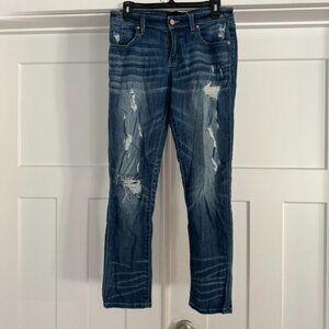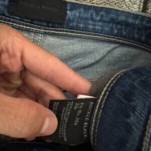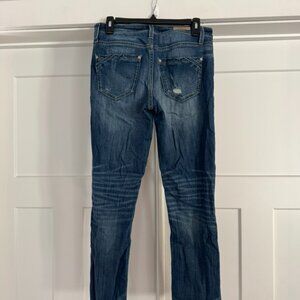 Classic pair of Buckle Black jeans in a medium wash with heavy distressing on the front and light fading throughout for a broken-in, vintage vibe. Features include: