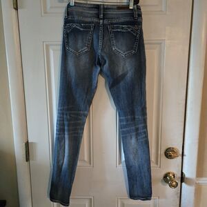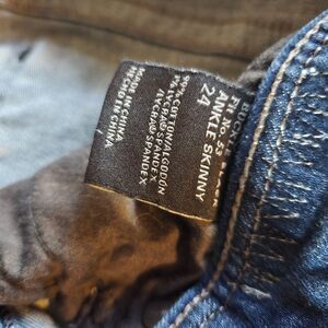 Buckle Black Fit No 53 Ankle Skinny Jeans women size 24, approximate measurements flat lay are 28" Waist, 7.5" Rise, and inseam 30." They feature a stylish and distressed denim design with a low-rise. The jeans also feature a stretchy fabric blend of spandex and cotton, making them suitable for various seasons and occasions, from casual outings to more trendy events. With their distressed detailing and logo accents, these jeans bring a cool and edgy vibe to any wardrobe.