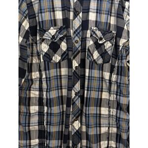 The product is a stylish Buckle Black Label No 048 Blue Gray Plaid Long Sleeve Button Up shirt in size XL, perfect for men who appreciate a slim fit and a cowboy theme. Made from comfortable cotton material, this shirt features a blue and gray plaid pattern, long sleeves, and a classic button-up style. Ideal for casual wear, it adds a touch of rugged masculinity to any outfit while keeping a sharp and polished look.
