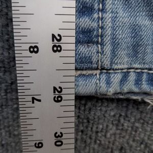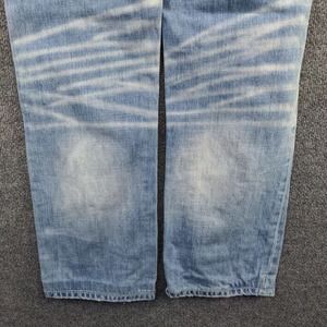 Condition: 100% Cotton relaxed straight jeans. Light wash denim. Blemish on front as pictured. Distressed.