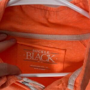 Gently Used Buckle Black Short Sleeve Polo. This is a men’s XL, although I’d say runs a little small. Kind of a neon creamsicle orange. Soft terry cloth feel. Great summer polo! 50% polyester, 38% cotton, 12% rayon.