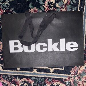 Chic black shopping bag with bold Buckle branding. Ideal for daily errands.