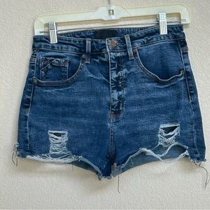 Buckle Black Shorts Women’s Fit No. 75 Dark Wash Distressed High Rise Jean Size 26 Raw Hem Cutoff Denim