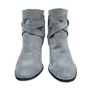 Taupe (tan/gray) sueded leather upper w/ crisscross decorative harness strap detail & adjustable buckle. Shaft hits just above ankle, round toe, side zip, chunky heel. Issues noted in photos. Excellent preowned condition, overall. Size 8.5M by Sam Edelman. Style: Morris.