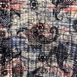Euc. No flaws. Hardly any wear at all. Velvet raised geometric design. Pink fold back contrast cuff.