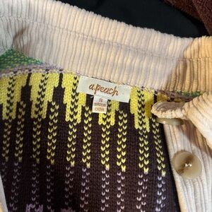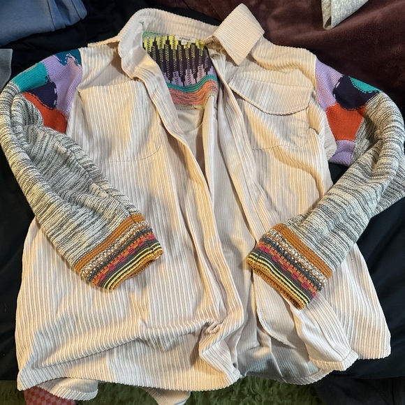 Unique patchwork design. Multicolor sleeves. Button-up front. Stylish and vibrant.