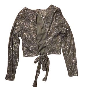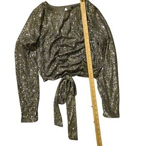 This is a stylish Gray Cropped Blouse by Buckle, featuring Sequin accents on the front. The blouse has an open back and a gathered front design, making it perfect for occasions like travel, weddings, and parties. Made of Polyester and Spandex, this Size Large blouse is ideal for the Summer, Fall, and Spring seasons.