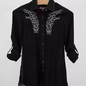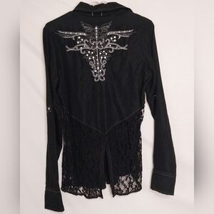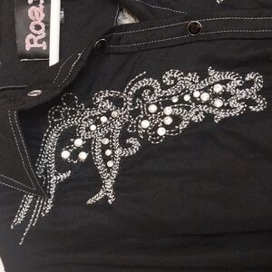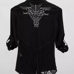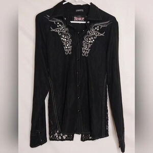 Roar Whirlwind Snap Up Shirt, Size S, Black, Silver, Rhinestones, Lace, Previously Loved, Very Good Condition, Casual. Party, Country, Western, Buckle