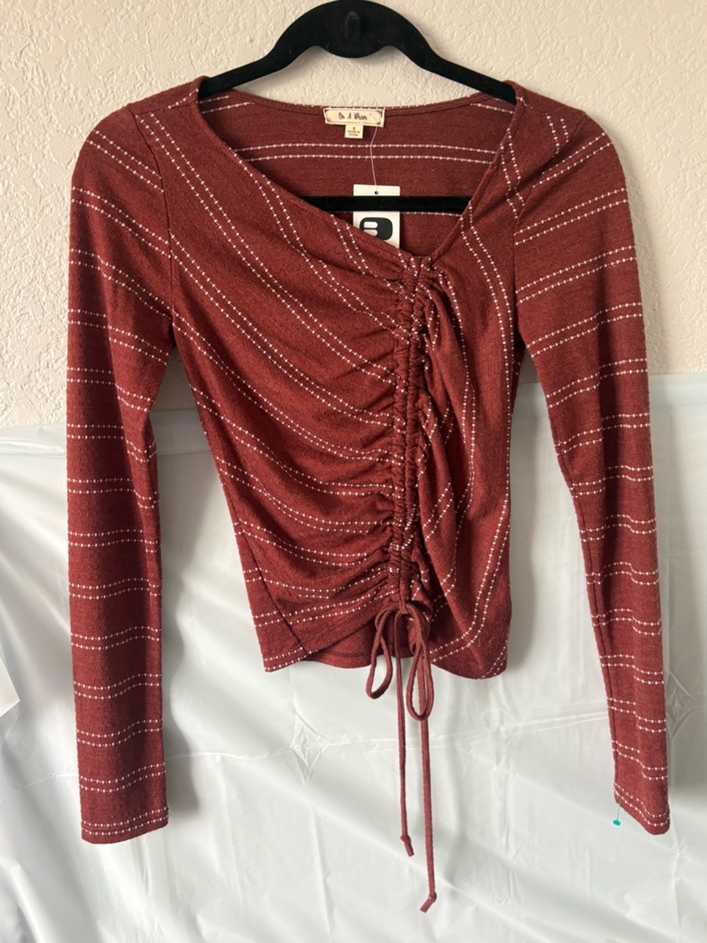 Long-sleeve knit top with center ruched detail and adjustable drawstring. Scoop neckline and fitted silhouette. Subtle horizontal stripe texture. Casual and easy to layer. Slightly cropped. Would look cute with a high waisted pant