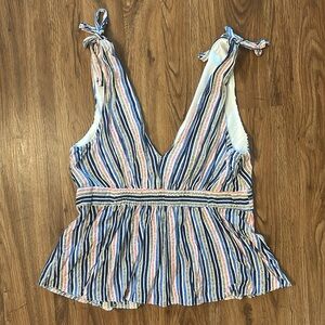 Cute ties at the top of the straps and a lining, with a flowy bottom half. Elastic in the back ensures a flattering figure.