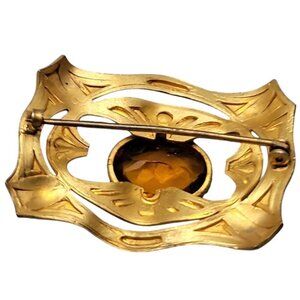 This exquisite Buckle Style Czech Glass Brooch features a captivating light brown Boho stone set in a gold-tone setting. Its vintage charm makes it the perfect accessory for any outfit.