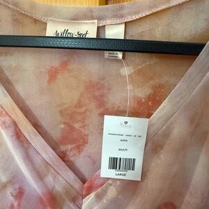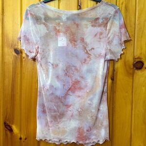 Chic Willow tie-dye top. Features a V-neck design. Soft pink and cream hues. Ideal for everyday style.