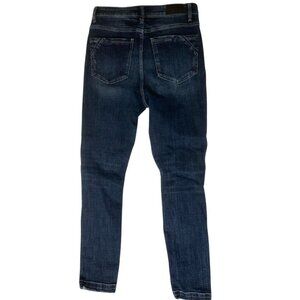 Stylish dark blue skinny jeans. Distressed detailing. Perfect for casual wear.