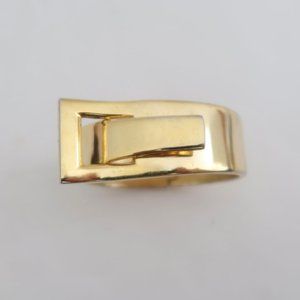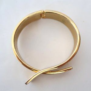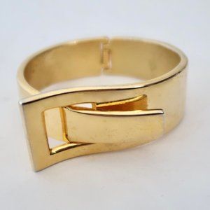 Gold tone hinged bracelet with modern buckle front detail.