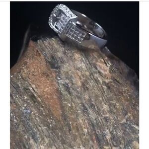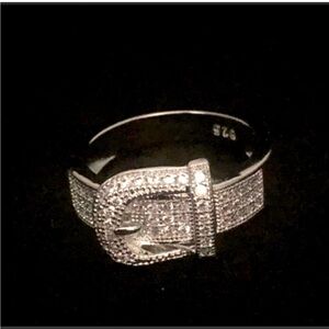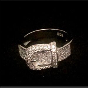 Buckle ring sterling silver 925 cubic zirconium stones size 7 ordered online ring is too large for my finger. I wear a size 5. It’s a size 7 super cute shiny sparkly brand new without tags comes with box.