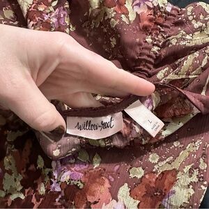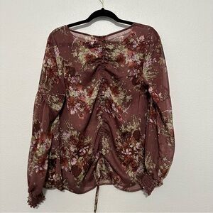 Buckle willow & root women’s Metallic Floral Print Top size L large sheer wine cinch back