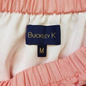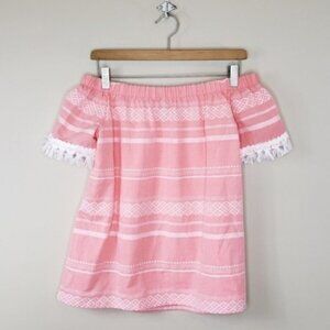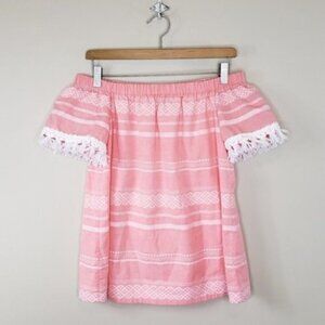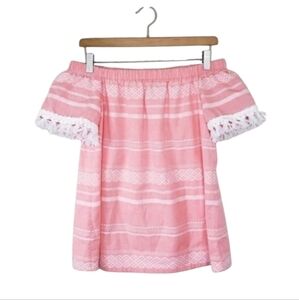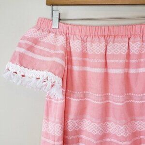 Beautiful pink top white white embroidery detail and fun sleeve tassel detail. Elastic top, lined.